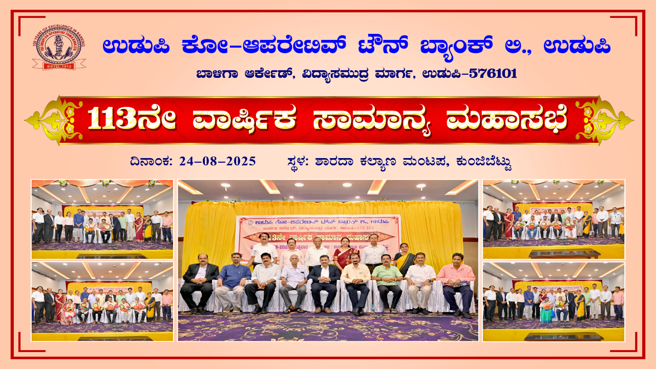 Established as Udupi Co-operative Society in the year 1912, The Udupi Co-operative Town Bank was founded by a Supreme personality Late Shri Bahaddur Haaji Abdulla Haaji Kasim Saheb Bahaddur (Who is also the Founder of Corporation Bank). He was the Founder President of the Bank. Shri. Molavalli Shivaraya, a well-known cooperative personality who has been called as the Father of Co-operative movement in the un-divided South Canara District has supported for the uplift of our bank. In the earlier days our bank was called as “Moodanidamboor Sahakara Sangha” in routine, since it was situated in the Moodanidamboor village of Udupi town.